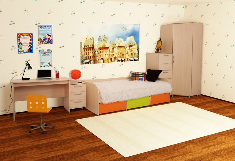 Детская мебель этого комплекта отличается сдержанным, но ярким стилем и функциональностью. Такой гарнитур подойдет как и малышу, так и подростку. Светлые тона и цветные вставки расширят пространство и не дадут заскучать. Мебель выполнена из качественной ЛДСП. В комплект входя следующие модели: