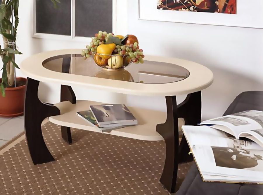 Стол журнальный Маджеста-2 - красивый овальный журнальный столик смотрится особенно стильно из-за модного сочетания материалов, цветов и неординарной формы ножек. Овальная столешница установлена на фигурные ножки, на которых закреплена полочка. Столешницу украшает вставка из тонированного закаленного стекла - и стильно, и красиво. Столешница изготовлена из МДФ, полочка и ножки стола из ламинированной ДСП.
