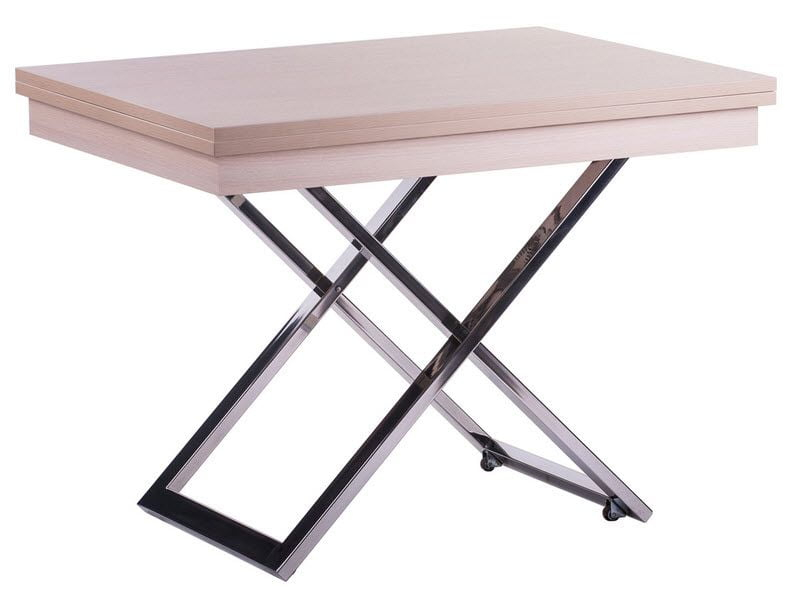 Стол-трансформер Cross — универсальная модель. В сложенном виде стол не занимает много места, и выглядит как небольшой журнальный столик. За счет механизмов регулирования высоты и площади столешницы, модель может принимать вид обеденного стола или полноценного рабочего места. В опоре стола используется высококачественная фурнитура. Поверхность столешницы матовая, что контрастирует с металлическими ножками модели.